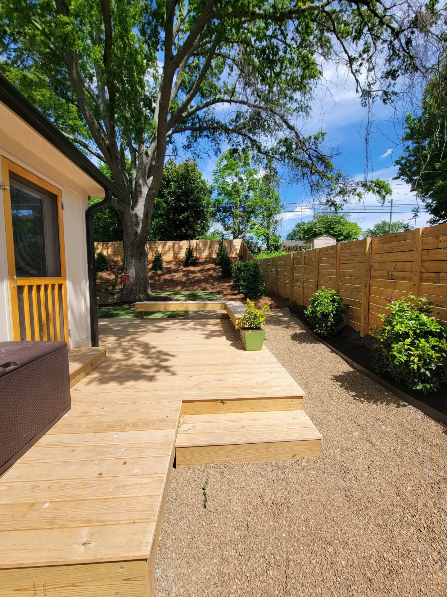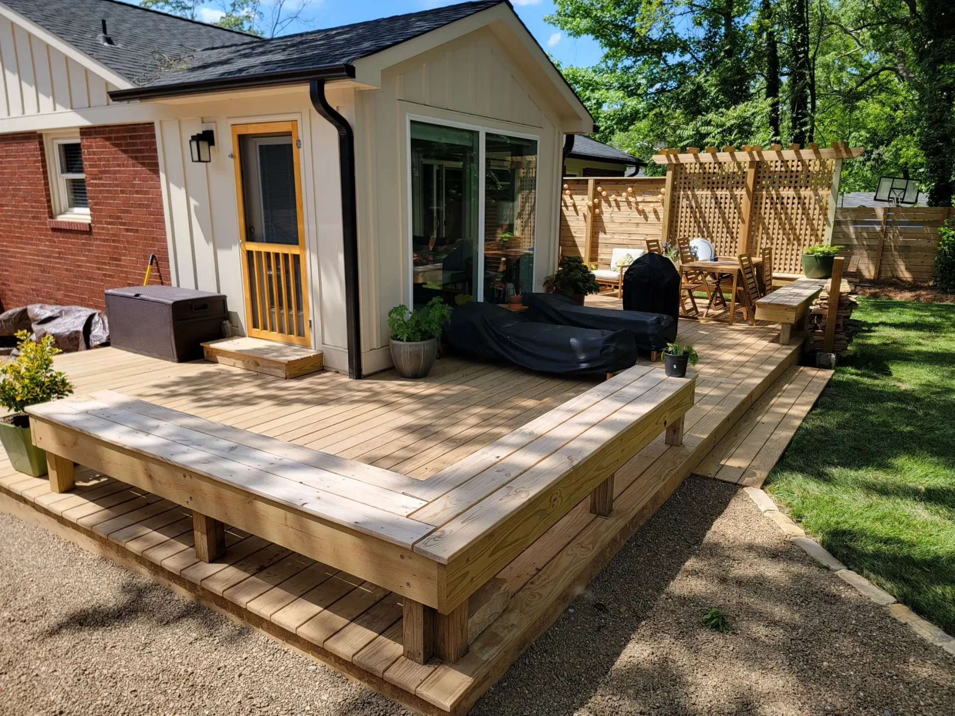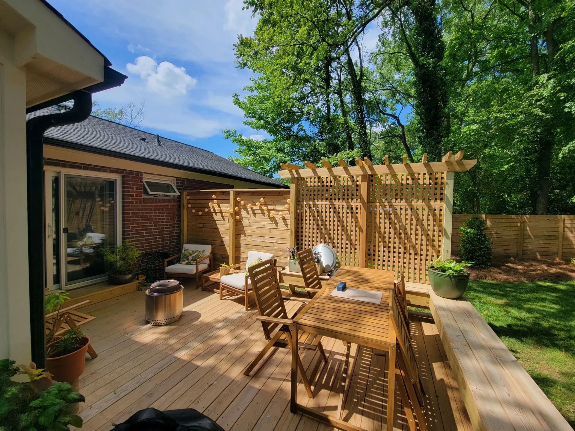 Utilizing functional design, we created a comfortable bench seating area on the outside corner of this deck. An arbour privacy wall was built by our skilled team of professionals that stands 10’ tall! All encasing this pressure treated wood deck measuring 400 square feet.