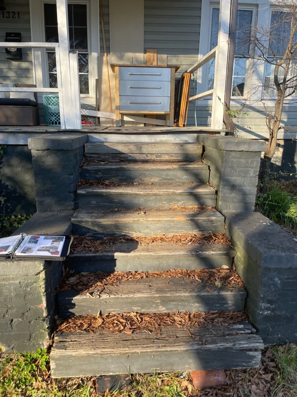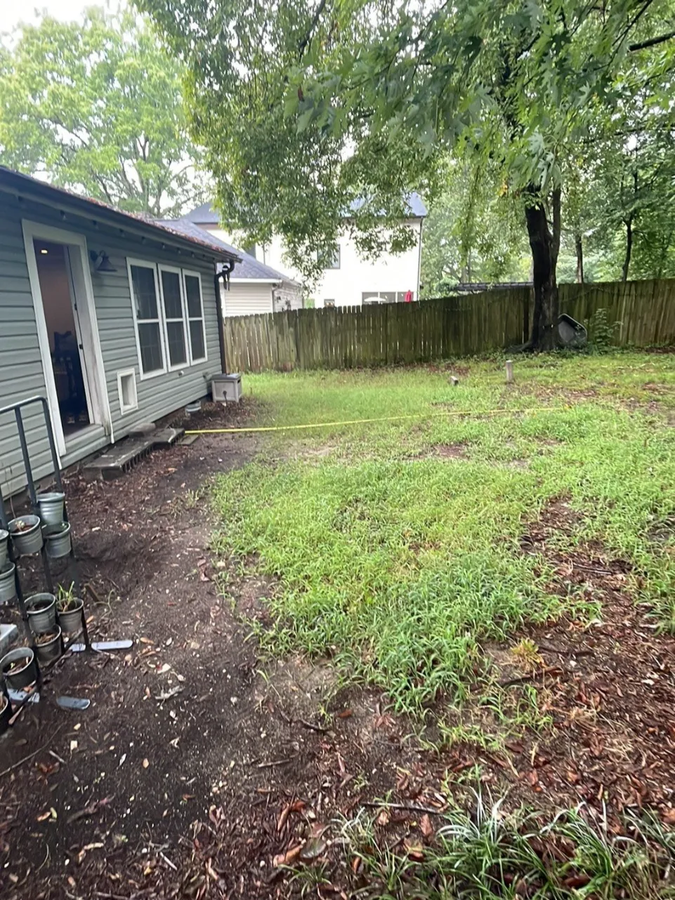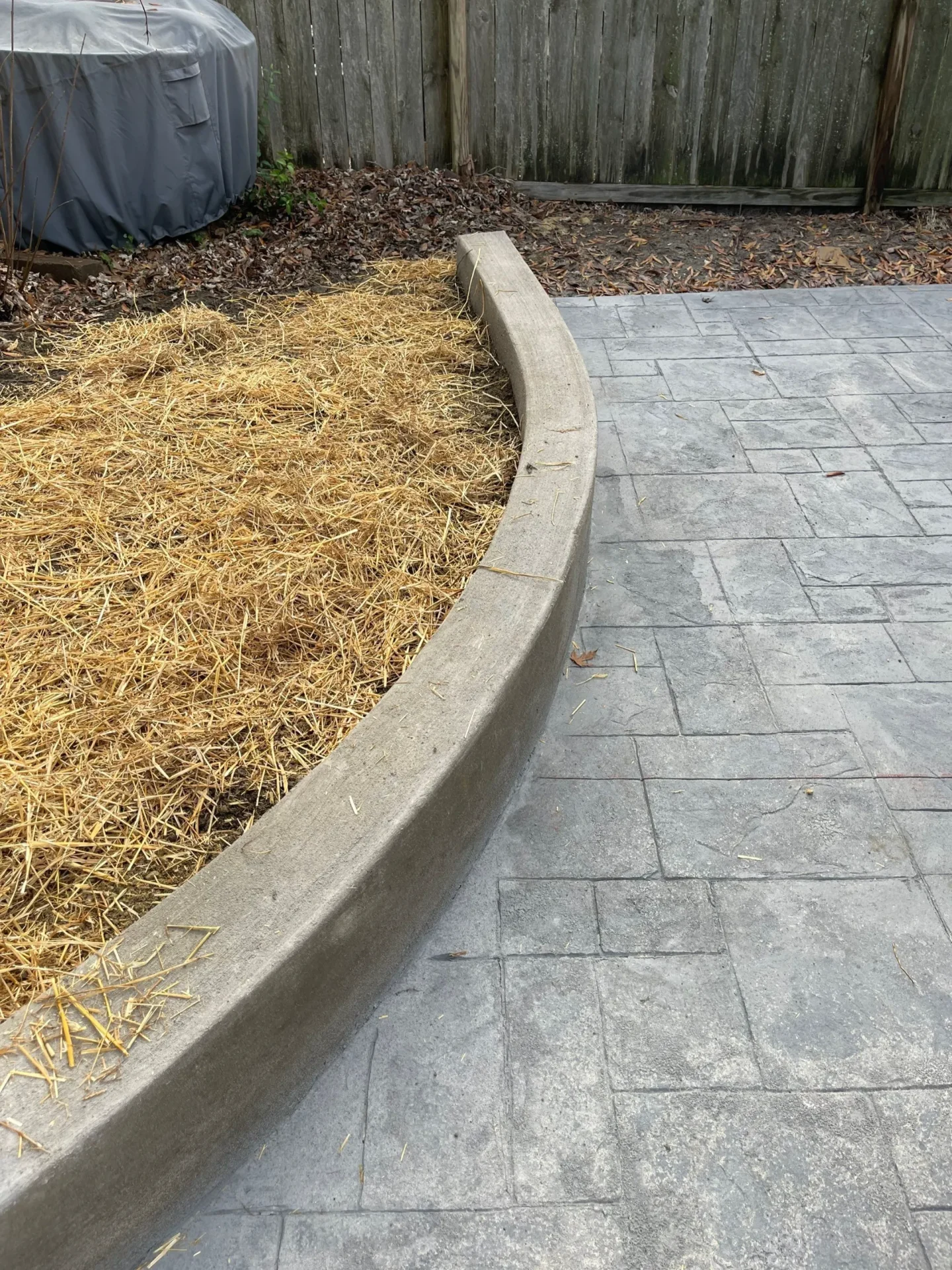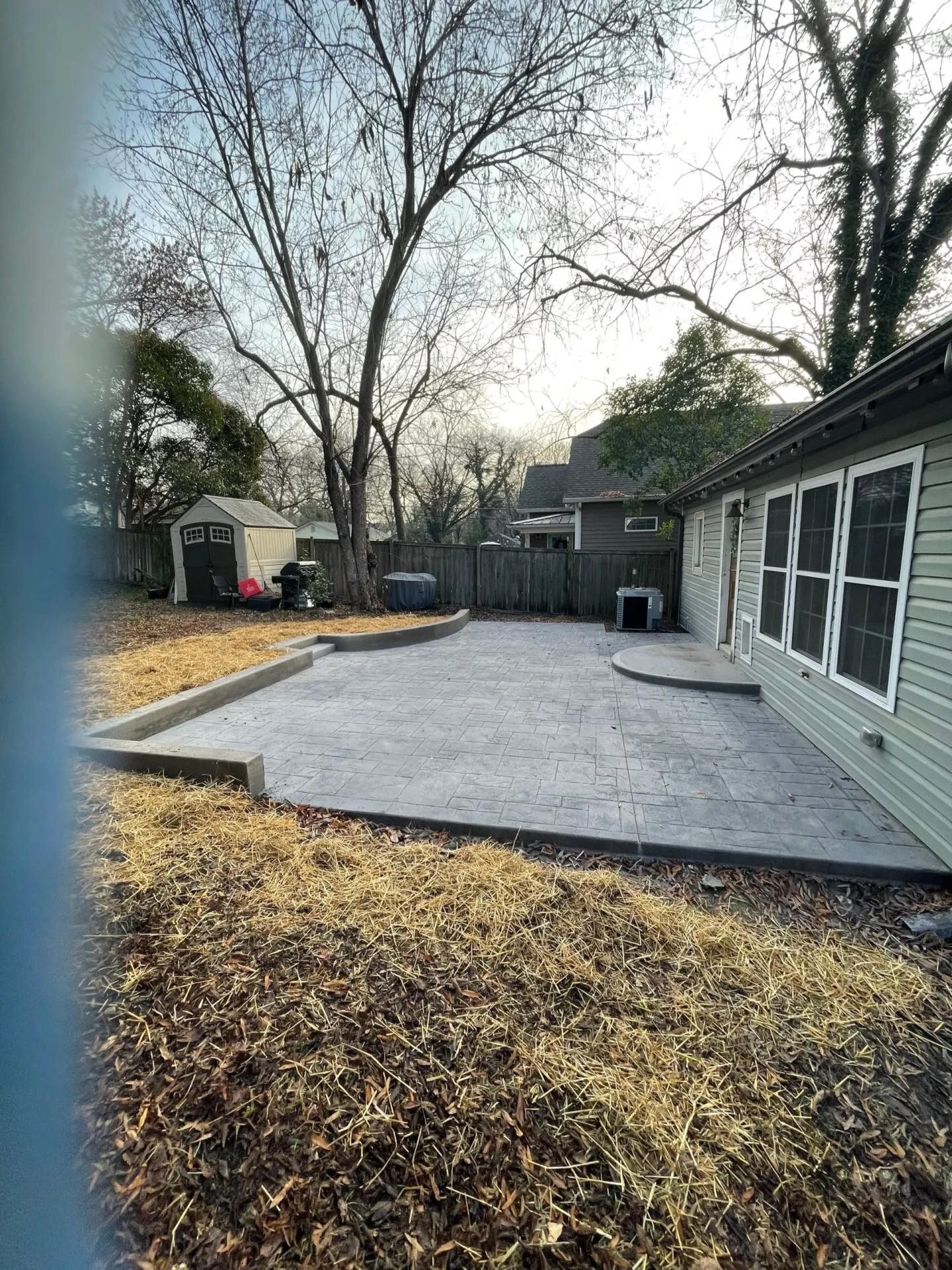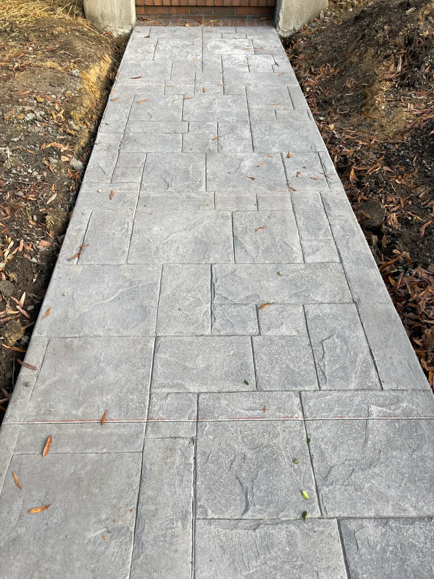 This stamped concrete patio, measuring 24 ft x 20 ft was completed with design around the A/C unit and cut out for the tree. Featuring an intricate 6 foot stair, curved from the back door and the addition of a 12” curb to the high side of the patio. We have a large selection of stamped concrete choices to choose from.